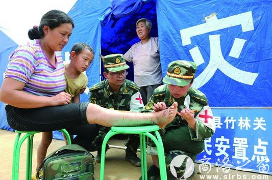 武警醫(yī)護(hù)人員為受傷村民療傷。(何衍貴 攝)