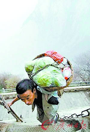 1公斤貨物背到西峰南峰掙6角,今天背了50公斤的水泵水管,30元運費,一年刨去4個月的淡季,天天早上6時起,自己燒飯,一步步在山道上掙命,下午傍晚下山,還得四處覓第二天的活,不怕苦,就怕沒貨可背。2003年一好心的游客送他一部舊手機,買了免月租的卡,人家有貨就可以打手機叫他,省得多跑路了。每月能給家里寄200元,總算盡到為人父為人子的責任吧。