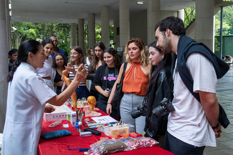 2025年4月15日,在巴西里約熱內盧天主教大學舉辦的“國際中文日”慶?;顒由希瑢W生們觀看中醫療法展示。新華社記者 王天聰 攝