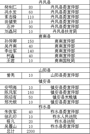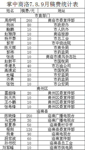 掌中商洛訊 掌中商洛自6月底上線以來,得到社會各界的廣泛關注,特別是得到廣大通訊員的大力支持。三個月來,共收到社會來稿300余篇,其中從中選用編發稿件230篇?,F將編發的稿件作者姓名、單位,發稿篇數等情況予以公布。請市直部門自公布之日起,本人持有效證件到商洛日報社辦公樓503號領取。七縣區的稿費,由各縣區宣傳部指定人員來報社新媒體部代領,再按相關人員分別發放。聯系電話:2395887。附用稿情況詳單: