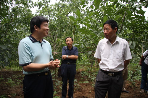 圖為西北農(nóng)林科技大學(xué)校長孫武學(xué)視察我市良種核桃豐產(chǎn)栽培技術(shù)推廣工作