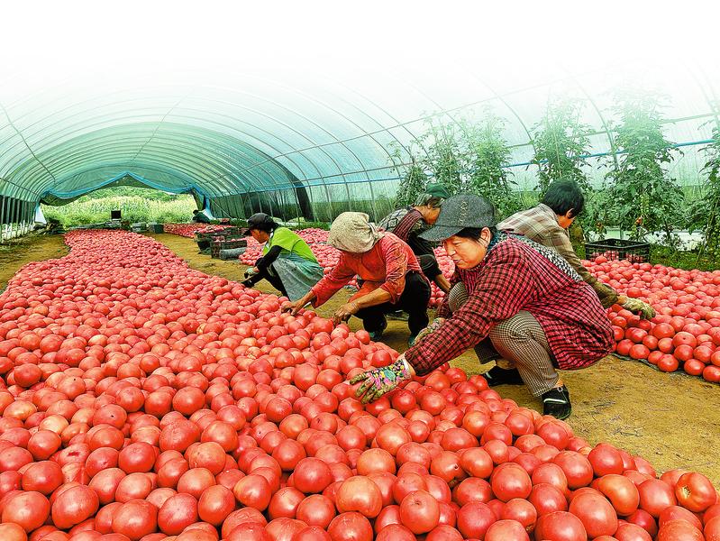 8月18日,筆者走進(jìn)洛南縣古城鎮(zhèn)中聯(lián)村集體經(jīng)濟(jì)蔬菜大棚,只見(jiàn)鮮紅欲滴的西紅柿掛滿了枝頭,在綠葉的映襯下顯得格外嬌艷奪目,大棚內(nèi)散發(fā)著誘人的果蔬香甜。進(jìn)棚務(wù)工的村民正在采摘西紅柿,等待裝箱的西紅柿像紅色的地毯一樣鋪滿地面,一派豐收喜人的景象。