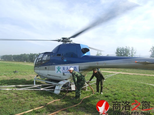 商洛日報訊 丹鳳縣近日首次使用飛機對商山、寺坪、資峪溝及鐵峪鋪等部分林區的3萬多畝林地進行飛機高空噴藥防蟲作業。圖為飛機正在準備進行預防葉峰蟲病害高空噴灑藥物作業。(劉春榮 王毅 攝)