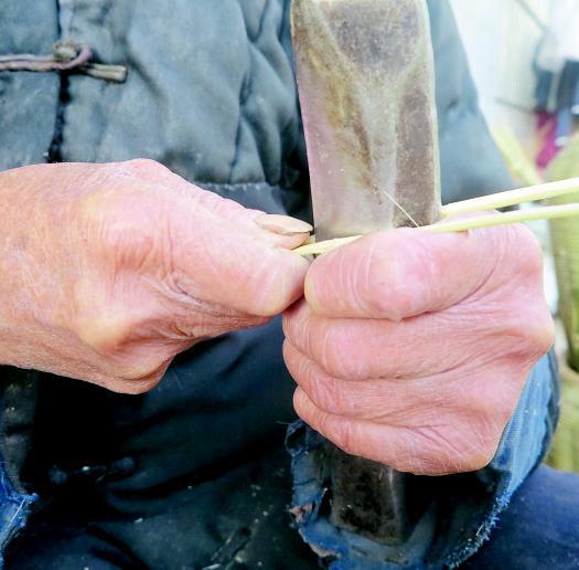 說著,一根根竹篾就在他的手中熟練的翻飛,記者注意到老人的手上長滿老繭,非常粗糙。“都是做這個磨的,才學(xué)的時候,經(jīng)常被竹子劃傷手,手上經(jīng)常是傷痕累累,花了一年多的時間才適應(yīng)。”老人說,他家的坡上有一畝地的竹園,編篾筐的材料用的都是自家的竹子。編篾筐首先要把竹子劈成細(xì)條,這是一個技術(shù)活,也是編好蔑筐的一個重要環(huán)節(jié);然后根據(jù)要做的物件進(jìn)行編制。他說,做竹器最重要的還是得有耐心,能坐得住,他的兒子和16歲的小孫子都會做,但因為銷路問題,想靠這個謀生也不現(xiàn)實了,還有重要的一點就是他們根本耐不住性子,自然也就不愿意做了。老人很悲傷地說,看來編制篾筐的手藝在不久的將來將會失傳的。